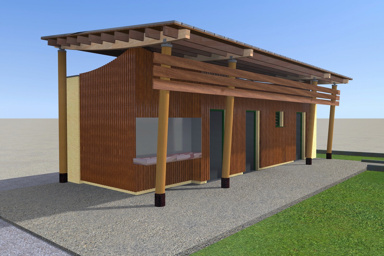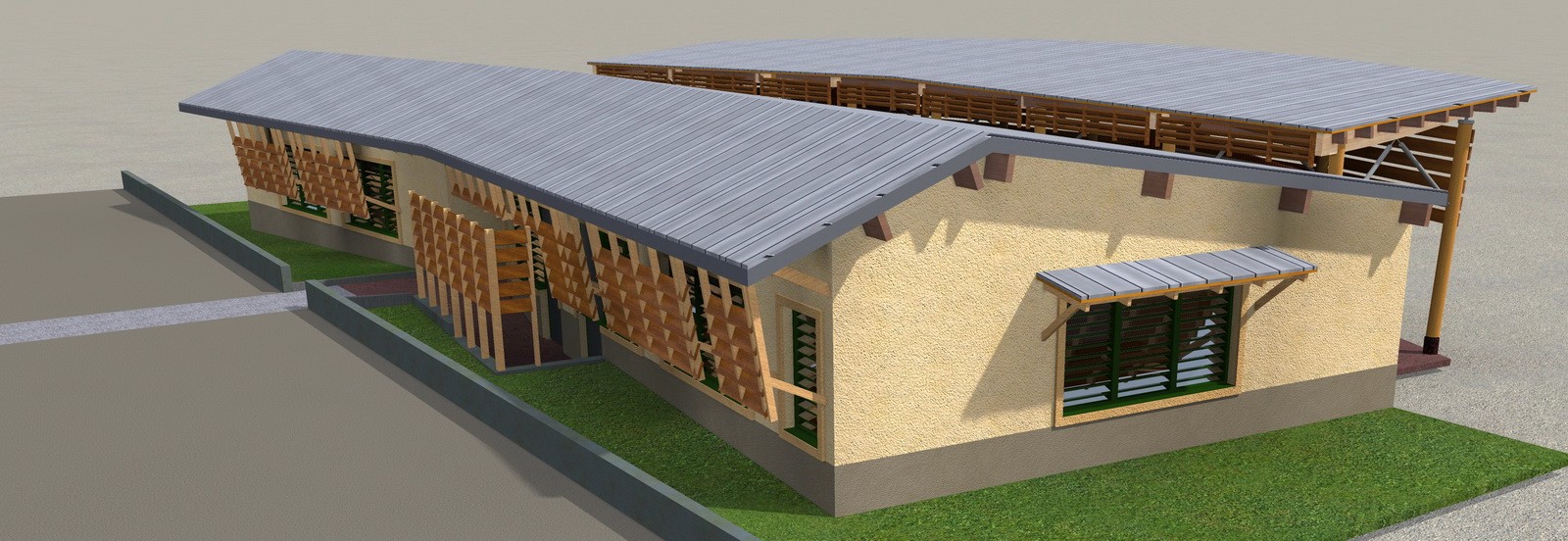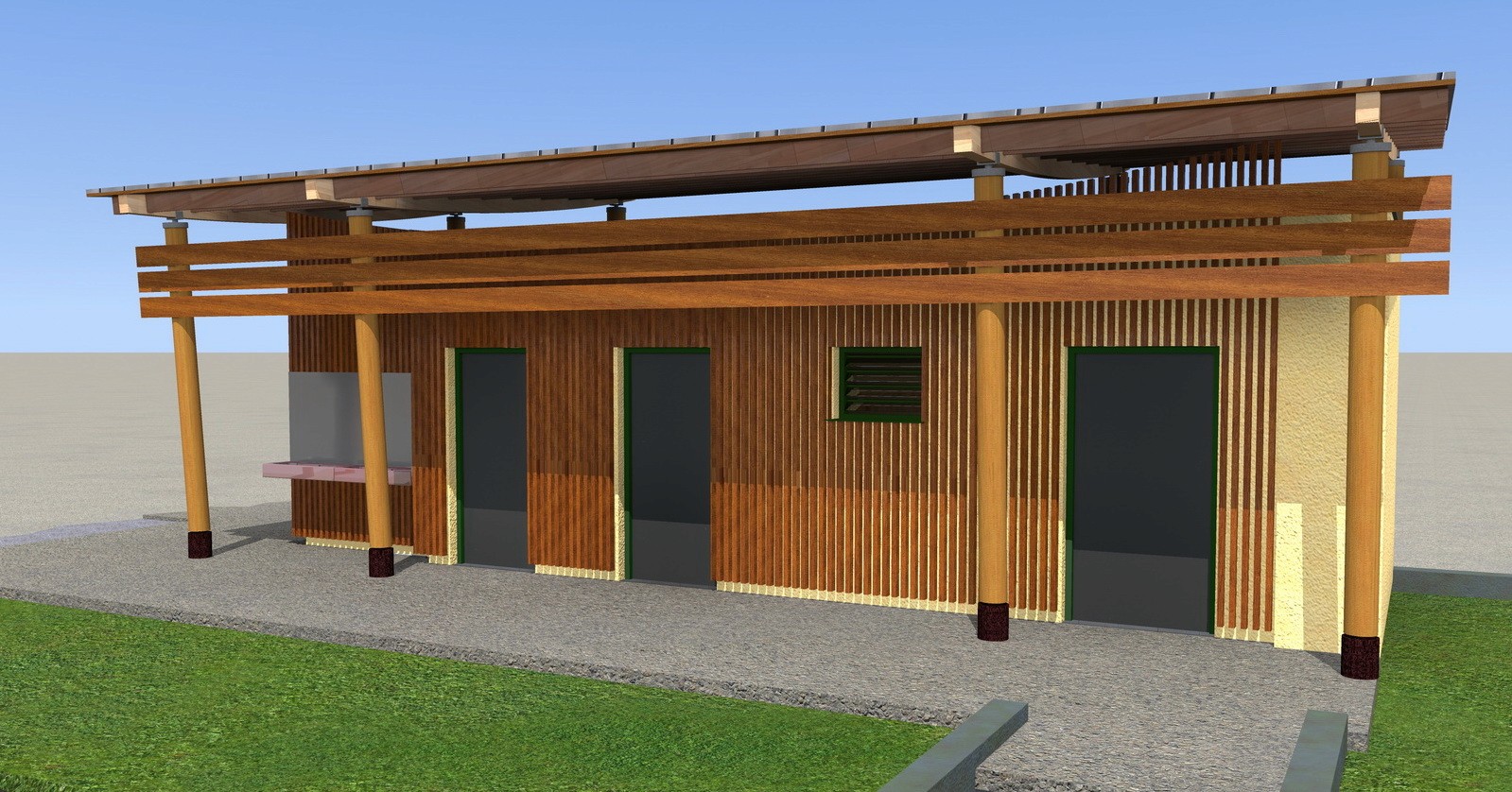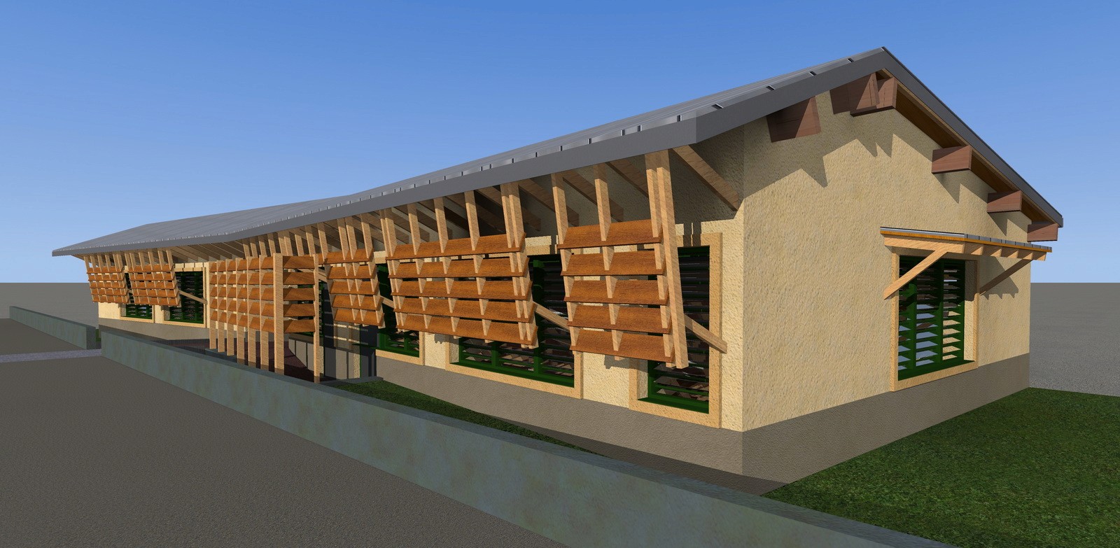 Le bâtiment est réalisé avec des matériaux naturels, principalement du bois, et des teintes soigneusement choisies pour favoriser son intégration dans l’environnement.