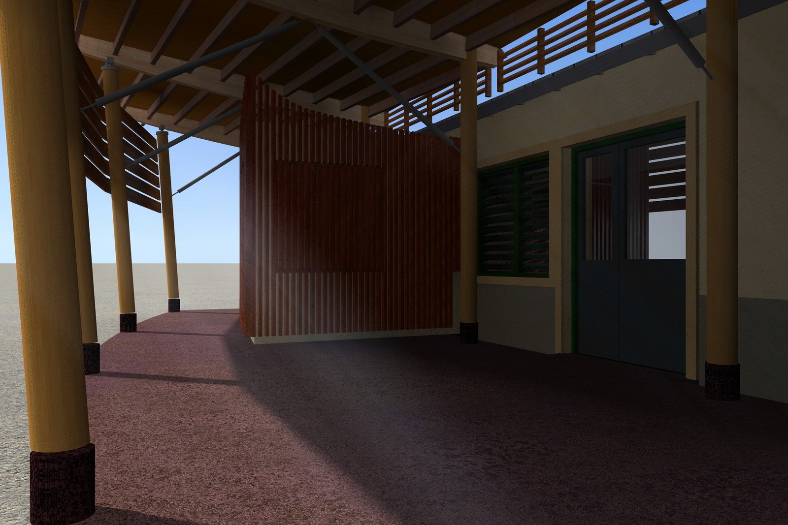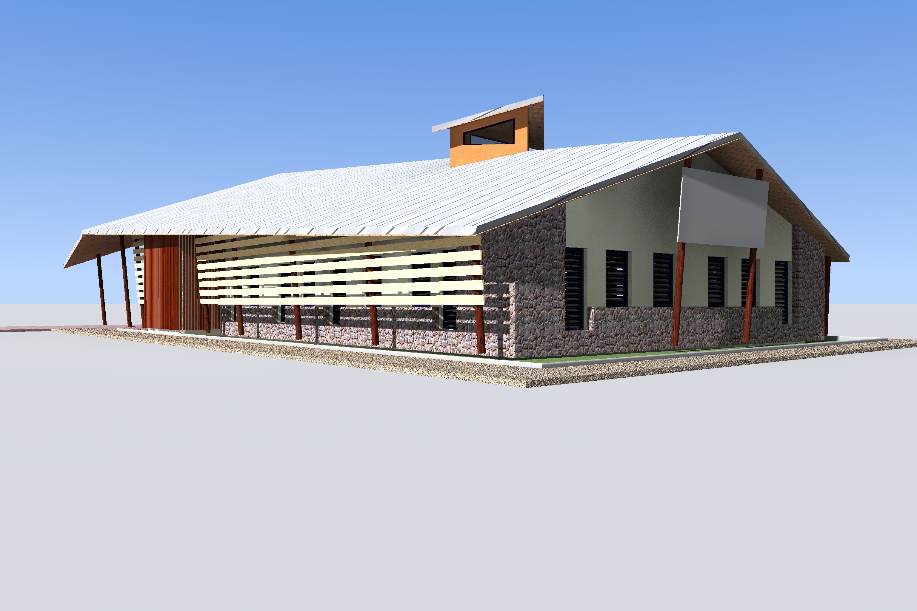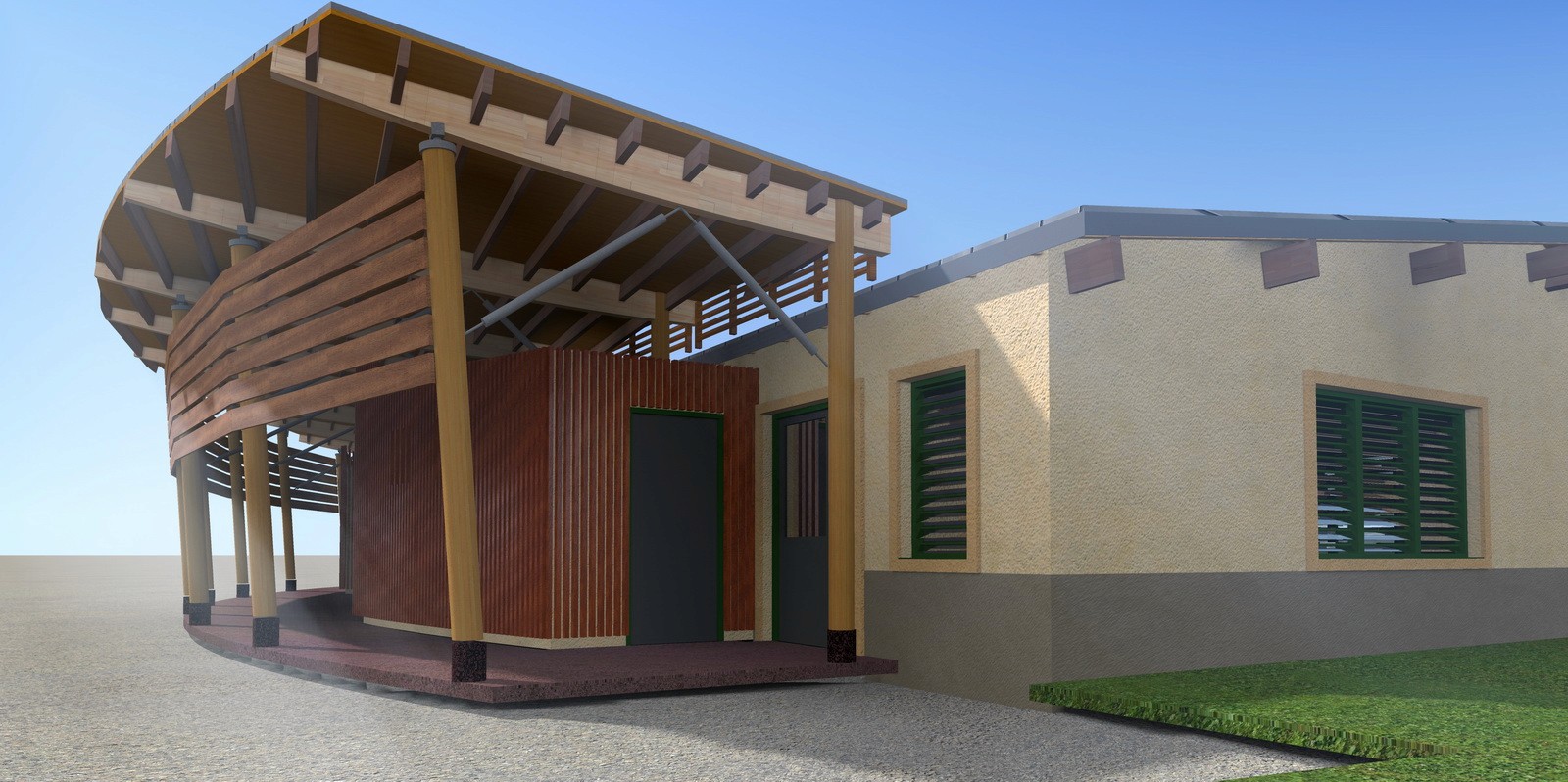 Le bâtiment est réalisé avec des matériaux naturels, principalement du bois, et des teintes soigneusement choisies pour favoriser son intégration dans l’environnement.