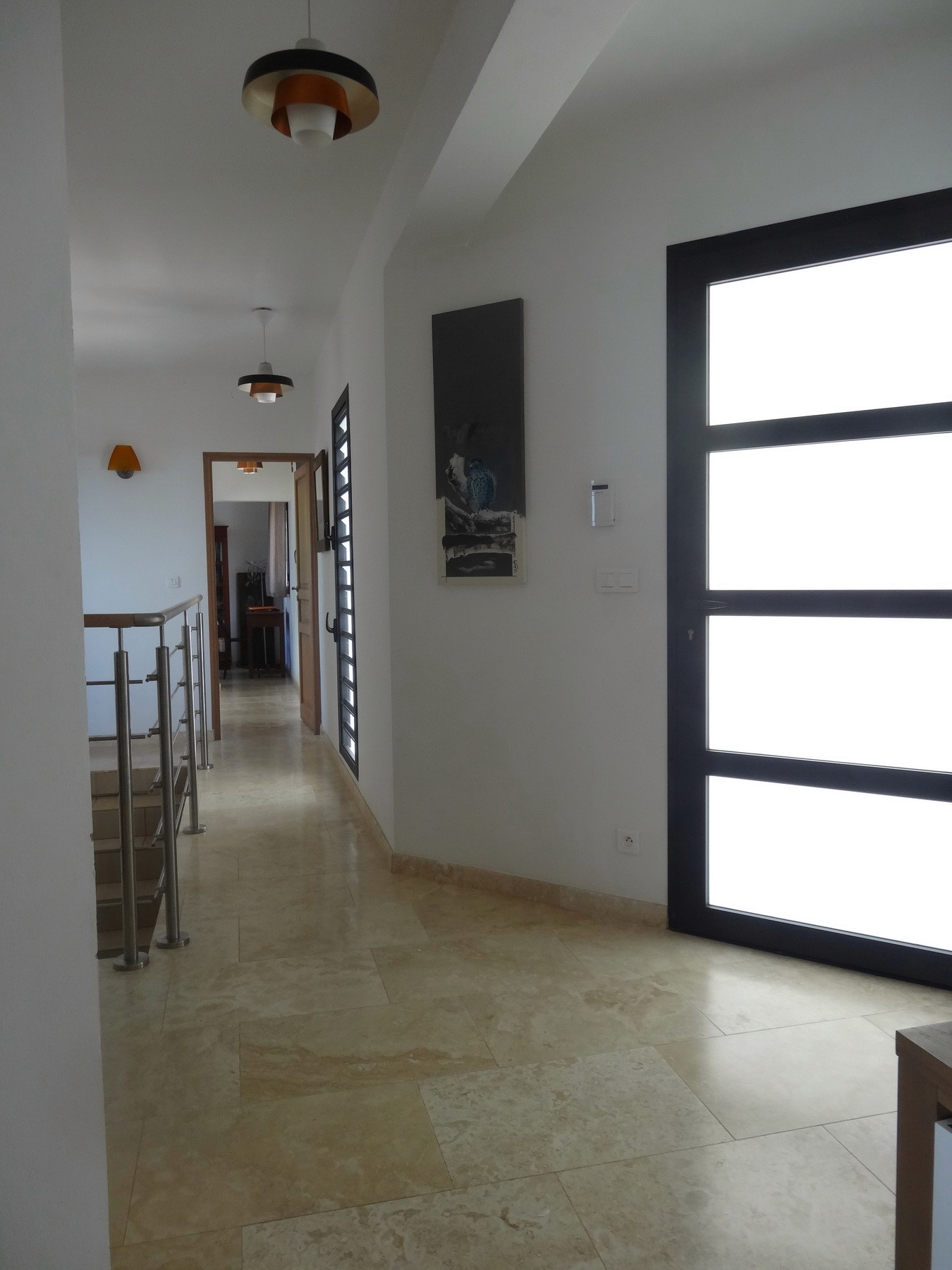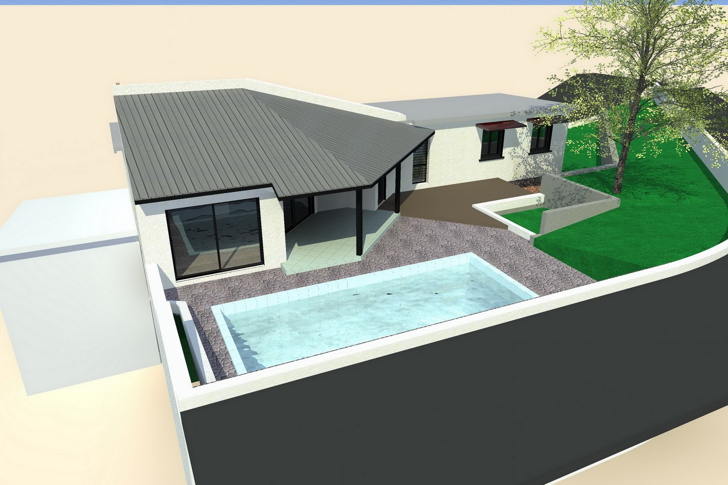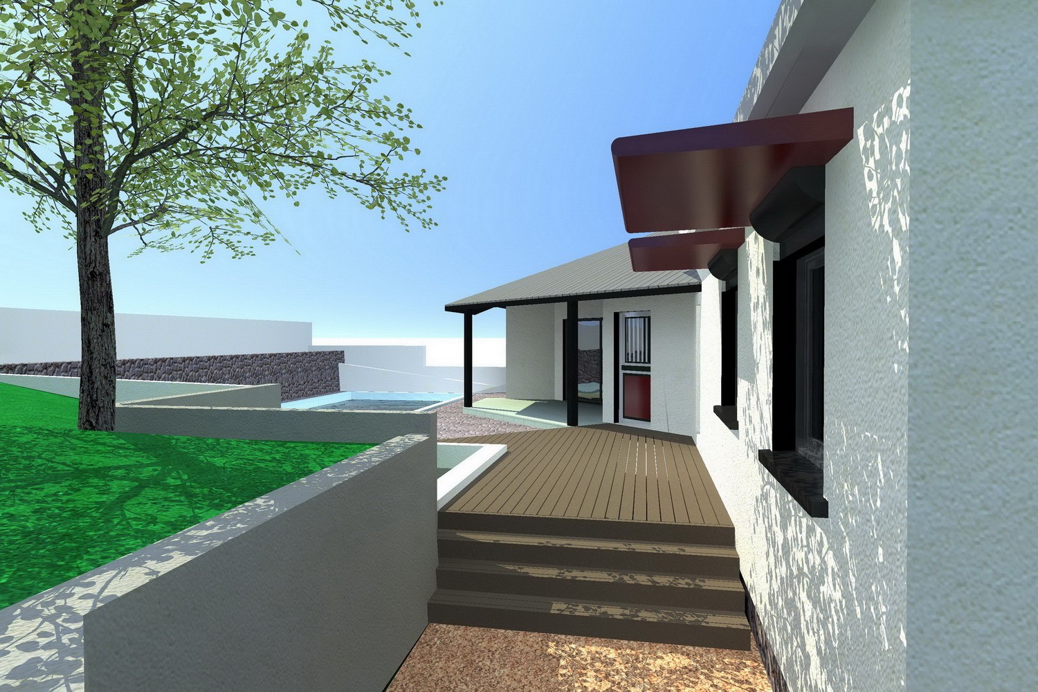 Une porte permettra d’accéder au rez-de-chaussée. En fond d’abri voiture, un escalier permettra l’accès au rez-de-chaussée en contournant l’existant. L’arrière, réaménagé, offre une zone comprenant l’extension, la piscine et sa plage, un caillebottis en composite et un espace vert. L’accès à la villa se fait par cette porte située au rez-de-jardin qui donne sur un petit hall et l’ensemble salle à manger, salon (existant et extension) et cuisine. Un couloir dans l’existant donne accès aux chambres, salle de bain et escalier pour le rez-de-chaussée