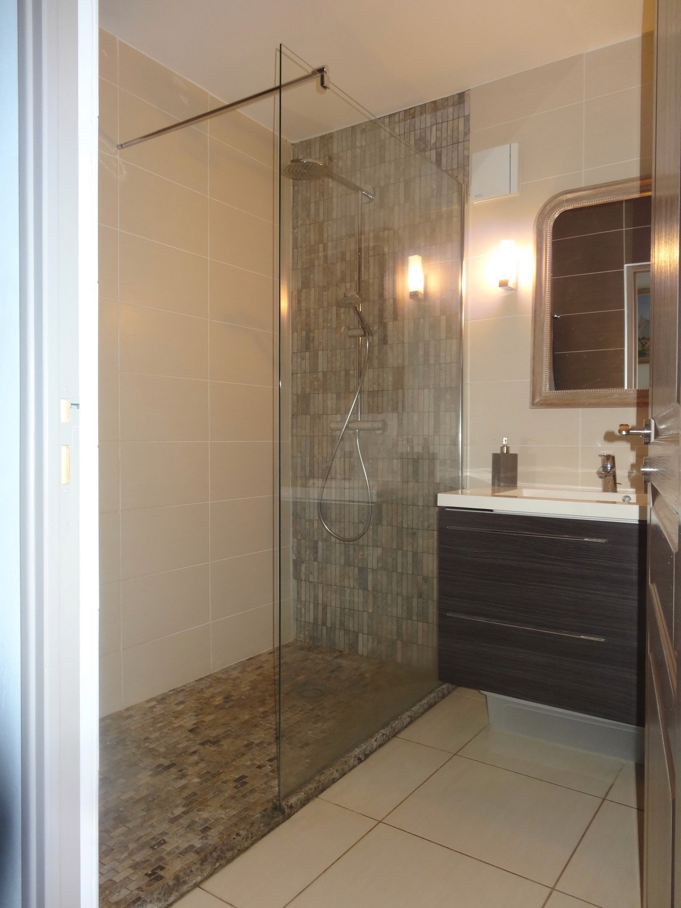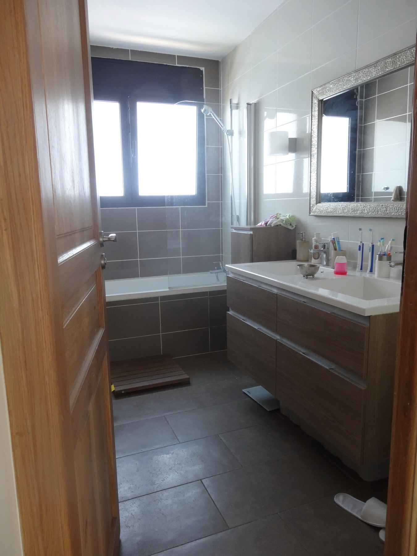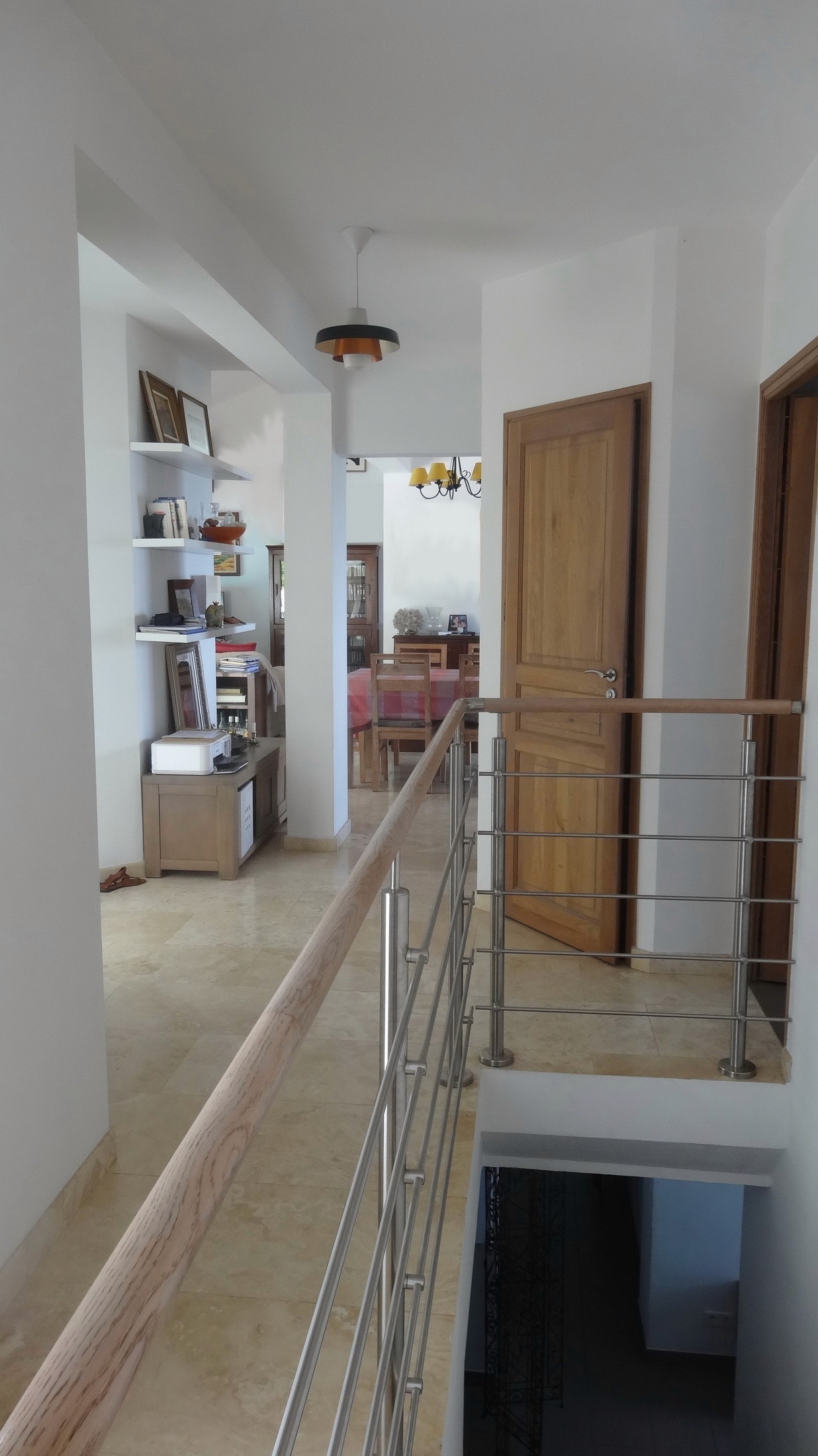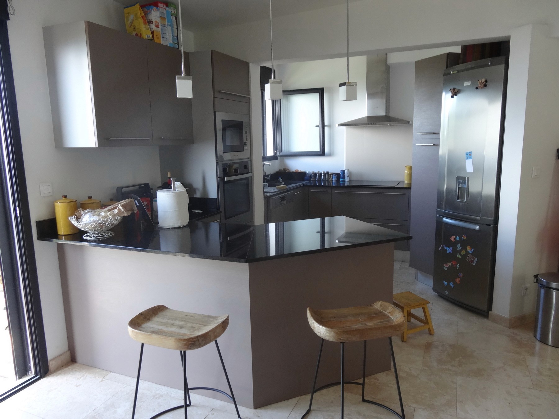 Une porte permettra d’accéder au rez-de-chaussée. En fond d’abri voiture, un escalier permettra l’accès au rez-de-chaussée en contournant l’existant. L’arrière, réaménagé, offre une zone comprenant l’extension, la piscine et sa plage, un caillebottis en composite et un espace vert. L’accès à la villa se fait par cette porte située au rez-de-jardin qui donne sur un petit hall et l’ensemble salle à manger, salon (existant et extension) et cuisine. Un couloir dans l’existant donne accès aux chambres, salle de bain et escalier pour le rez-de-chaussée